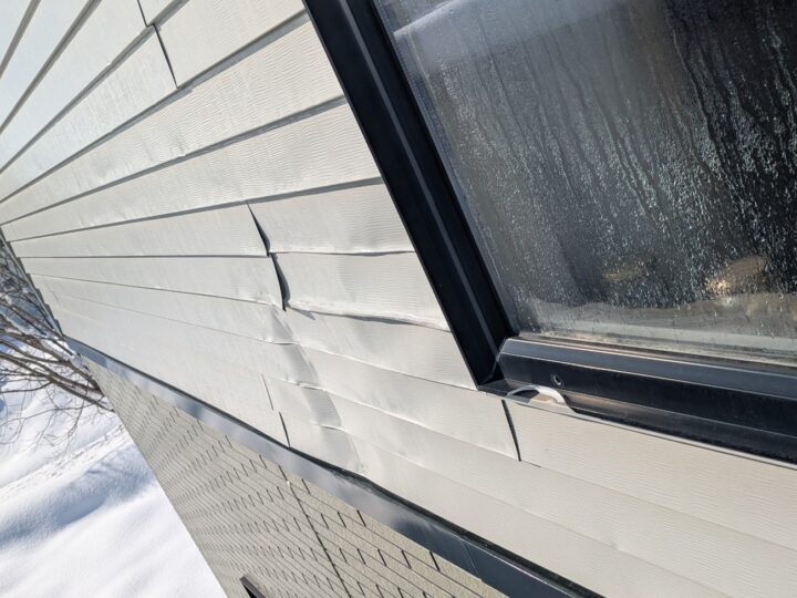 屋根の雪が落ちて、外壁とサッシが破損してしまった。