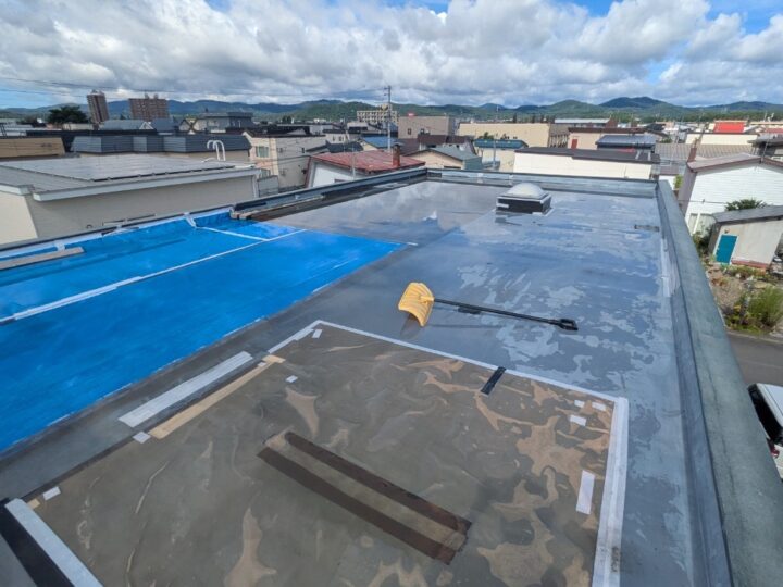 元々シート防水が施工させた屋根でしたが、シートの状態が悪く部分補修が出来なかったため、同時に木下地が腐食している可能性を考えシート防水の上張り工事を提案しました。